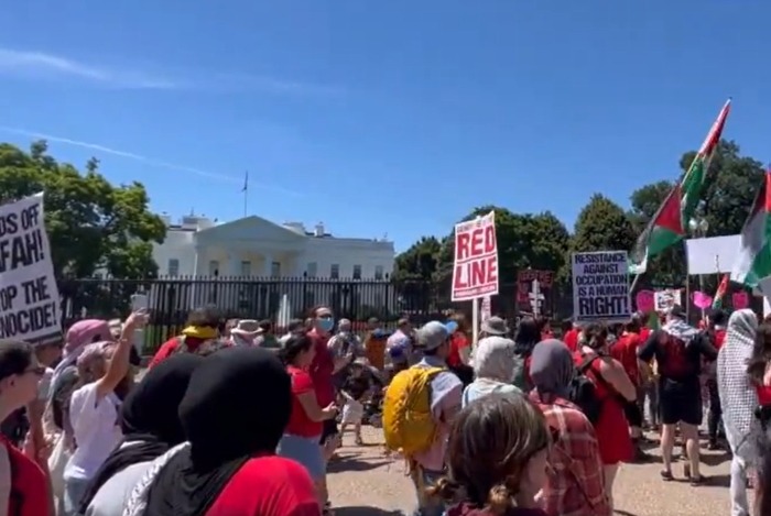 In a subsequent post, Scootercaster reported that the White House is now “completely surrounded” by protesters holding a large red banner, intended to symbolize their “red line.” Demonstrators erupted into loud cheers when both sides of the line joined together on the southwest corner of the White House complex. The majority of demonstrators were wearing red shirts as they chanted, “Free, free Palestine” and “Hold the red line!” One protester held a sign reading, “We got the guillotine, you better run!”