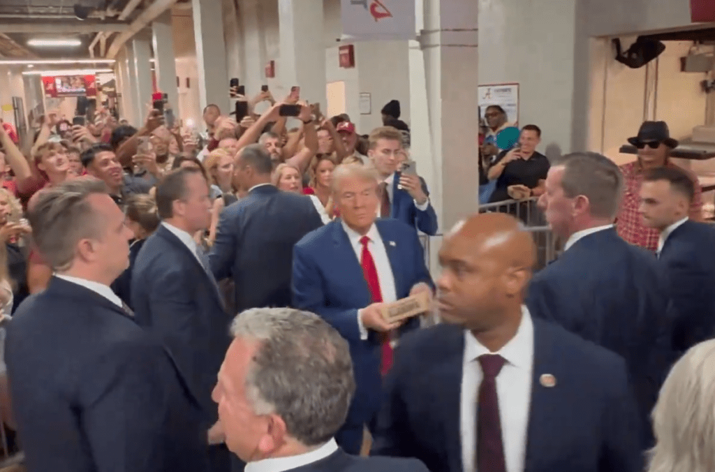 Trump, appearing to enjoy the moment, took time to distribute hats and other items to the large crowd. He received an enthusiastic response from the audience of 100,000 when his image was displayed on the stadium scoreboard toward the end of the first quarter. The Republican nominee was accompanied in his suite by Senator Tommy Tuberville (R-AL), Senator Katie Britt (R-AL), golf legend John Daly, musician Kid Rock, and several others. Once seated, chants of “USA” and “Four More Years” erupted from the crowd once again.