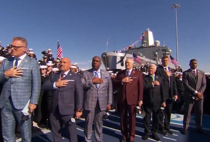 How fucking disrespect of @michaelstrahan to not have his hand on heart especially in front of all those Navy personal. You should be removed from the broadcast team. I hope there are repercussions for your actions. pic.twitter.com/tp5fg0T4Gz