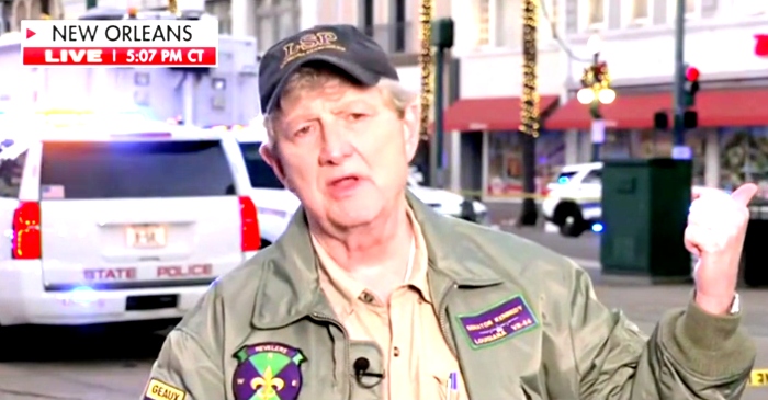 Sen. John Kennedy nonchalantly moved an FBI special agent from in front of a microphone during a press conference on the suspected terrorist attack in New Orleans on Wednesday that killed 15 and left double as many injured. The Louisiana Republican could be seen moving into position to essentially take over the podium as he was about to address a question. The agent, identified as Alethea Duncan, was also criticized for wearing a nose ring and for allegedly being a “DEI hire” who had difficulty providing details about the attack, even saying at one point that the bureau did not believe the deadly incident was terrorism.