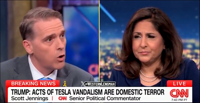 CNN’s Scott Jennings lost his temper during a heated debate with former Biden advisor Neera Tanden as he was criticizing recent attacks on Tesla cars and dealerships—actions linked to owner Elon Musk’s work for President Trump—when Tanden accused him of hypocrisy, pointing to the January 6 riots at the Capitol. “You’re saying that when a Tesla dealership is attacked, it’s unacceptable, but when the halls of Congress are targeted, we should pardon those responsible. Is that really your position?” Tanden asked.