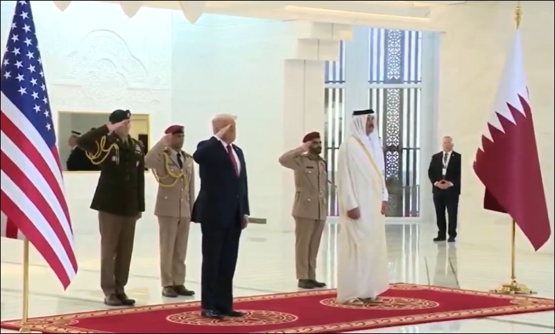 President Trump salutes as The Star-Spangled Banner plays in Doha, Qatar.