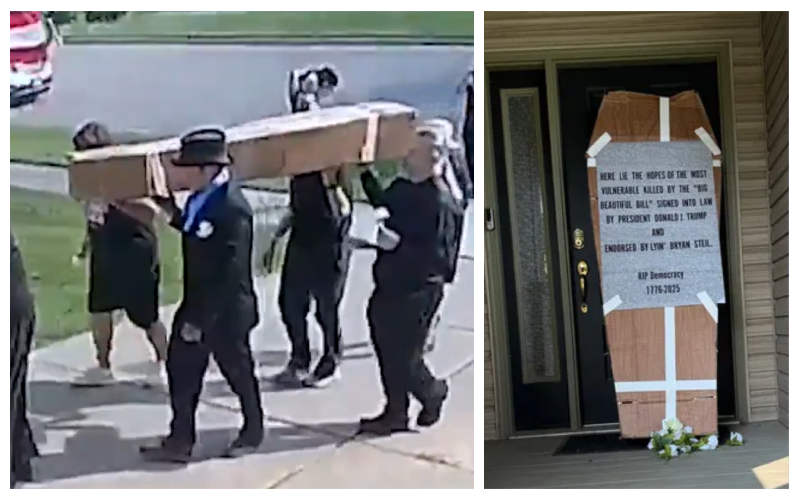 A sign affixed to its lid reads: “Here lie the hopes of the most vulnerable killed by the ‘Big Beautiful Bill’ signed into law by President Donald J. Trump and endorsed by Lyin’ Bryan Steil. RIP Democracy 1776-2025.”