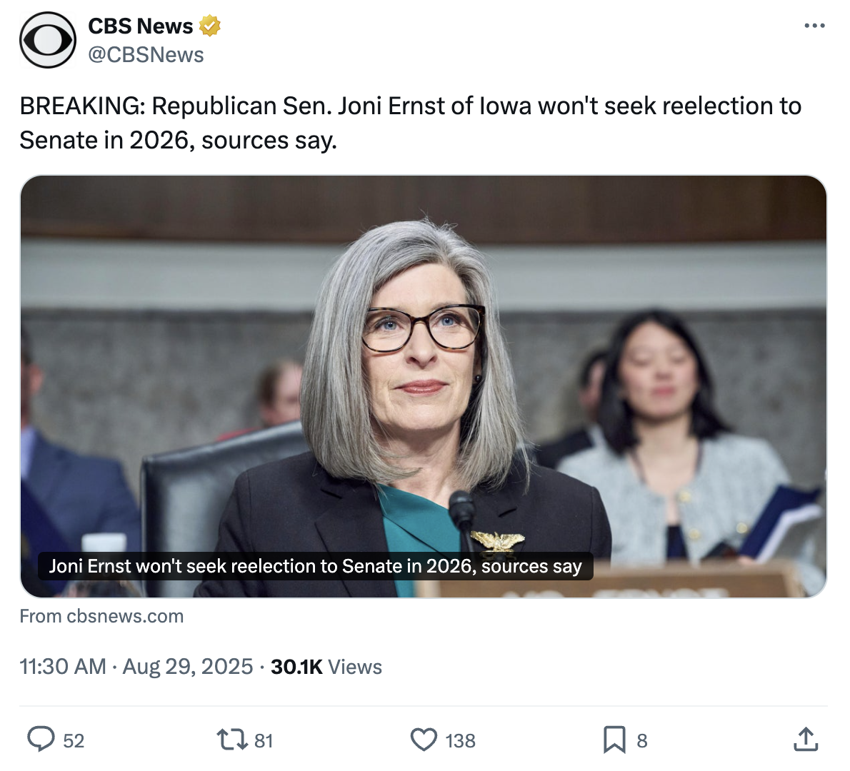 Sen. Joni Ernst (R-IA) announced Friday that she will not seek reelection in 2026, ending speculation about a possible third term. Her decision gives Republicans a favorable chance to retain the seat, as Iowa has trended solidly to the right over the past decade.