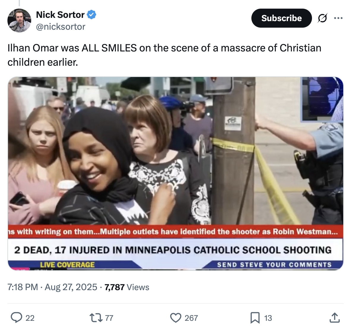 Rep. Ilhan Omar (D-Minn.) is being heavily criticized for a facial expression she made while visiting the site of the Catholic school shooting earlier this week near Minneapolis.