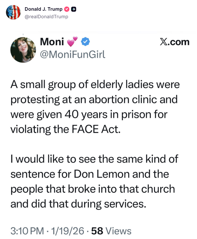 Will former CNN personality Don Lemon and the activist mob that disrupted a St. Paul church service finally be held to the same legal standard as the elderly pro-life protesters who were hauled off in handcuffs? Donald Trump clearly hopes so — even if it 40 years of prison time.
